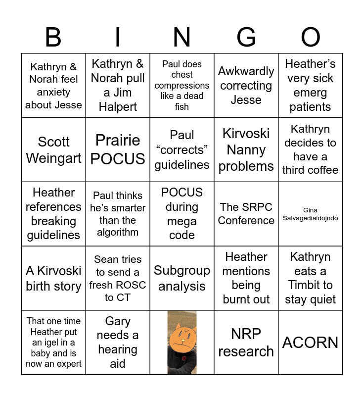 This bingo card has 1 images, a free space and 23 words: Sean tries to send a fresh ROSC to CT, Gary needs a hearing aid, Paul “corrects” guidelines, That one time Heather put an igel in a baby and is now an expert, Heather’s very sick emerg patients, Kathryn & Norah feel anxiety about Jesse, Scott Weingart, Kathryn & Norah pull a Jim Halpert, The SRPC Conference, Subgroup analysis, Kirvoski Nanny problems, Heather references breaking guidelines, Heather mentions being burnt out, Kathryn eats a Timbit to stay quiet, Prairie POCUS, NRP research, Gina Salvagediaidojndo, Paul does chest compressions like a dead fish, Kathryn decides to have a third coffee, Paul thinks he’s smarter than the algorithm, ACORN, A Kirvoski birth story and Awkwardly correcting Jesse.