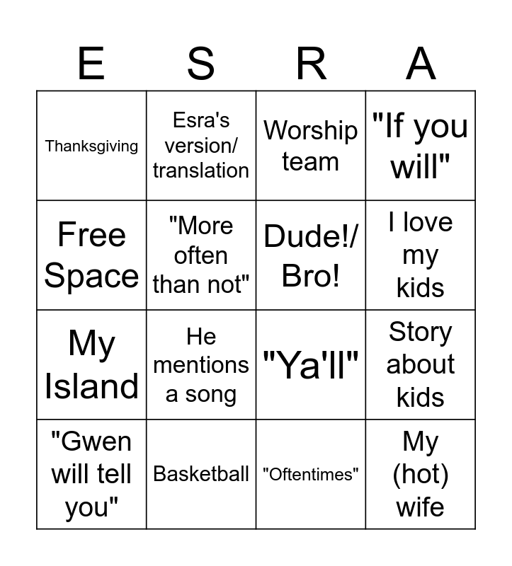This bingo card has 16 words: Basketball, Story about kids, Worship team, Thanksgiving, My Island, Esra's version/ translation, "Ya'll", "Oftentimes", Free Space, "More often than not", "Gwen will tell you", "If you will", He mentions a song, I love my kids, Dude!/ Bro! and My (hot) wife.