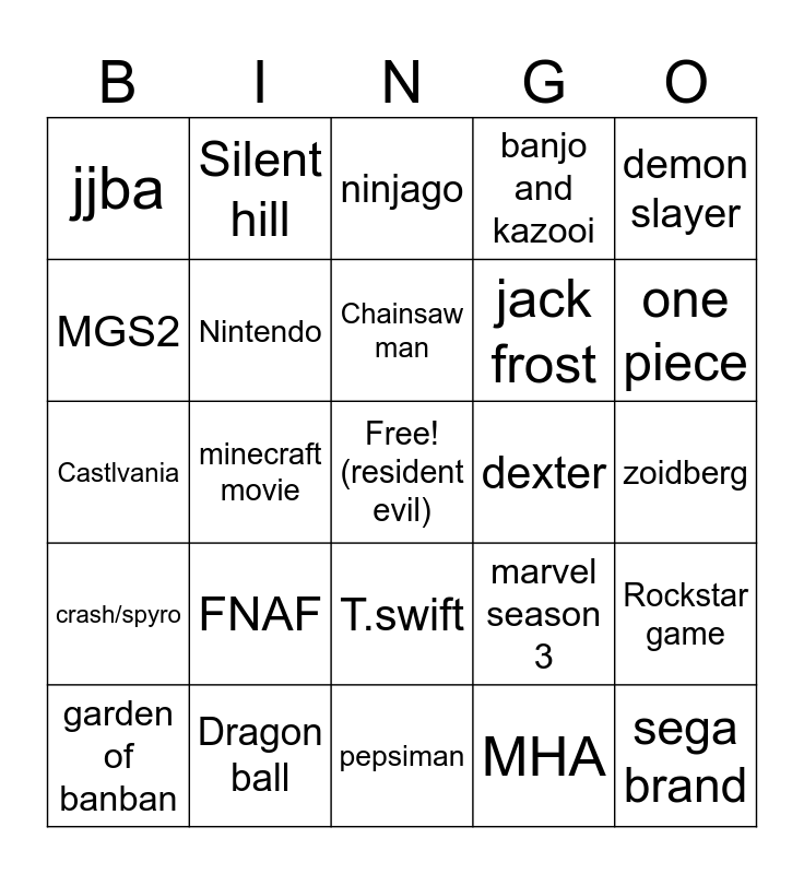 This bingo card has a free space and 24 words: FNAF, Dragon ball, Chainsaw man, garden of banban, demon slayer, jjba, MGS2, Silent hill, dexter, T.swift, jack frost, Castlvania, marvel season 3, Rockstar game, Nintendo, MHA, zoidberg, ninjago, one piece, minecraft movie, sega brand, crash/spyro, banjo and kazooi and pepsiman.