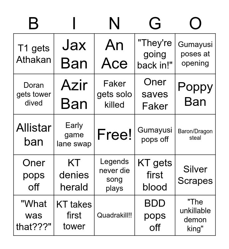 This bingo card has a free space and 24 words: KT denies herald, KT takes first tower, Faker gets solo killed, "What was that???", Gumayusi poses at opening, T1 gets Athakan, Doran gets tower dived, Jax Ban, Gumayusi pops off, Legends never die song plays, Oner saves Faker, Allistar ban, KT gets first blood, Silver Scrapes, Azir Ban, BDD pops off, Baron/Dragon steal, An Ace, Poppy Ban, Early game lane swap, "The unkillable demon king", Oner pops off, "They're going back in!" and Quadrakill!!.