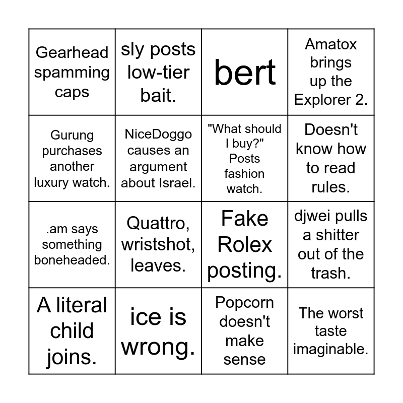 This bingo card has 16 words: ice is wrong., djwei pulls a shitter out of the trash., bert, Gearhead spamming caps, .am says something boneheaded., sly posts low-tier bait., Fake Rolex posting., Popcorn doesn't make sense, Gurung purchases another luxury watch., NiceDoggo causes an argument about Israel., A literal child joins., Amatox brings up the Explorer 2., Quattro, wristshot, leaves., Doesn't know how to read rules., "What should I buy?" Posts fashion watch. and The worst taste imaginable..