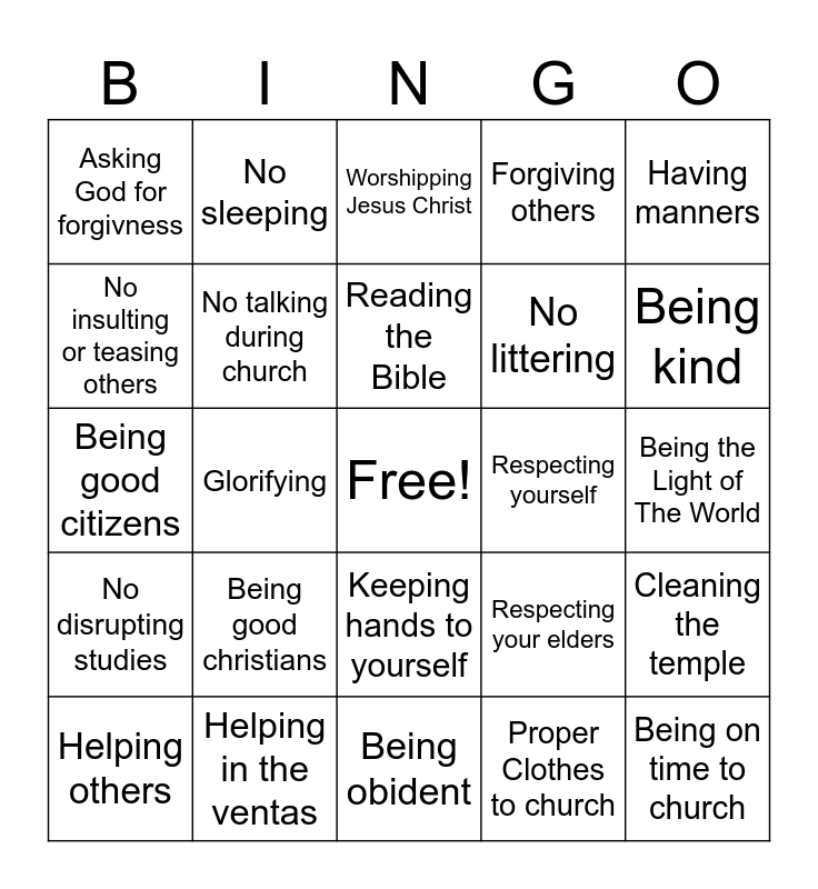 This bingo card has a free space and 34 words: Worshipping God, Proper Clothes to church, Participating in consecrations, Launguage, No disrupting studies, No talking during church, Having manners, Helping others, No sleeping, Paying attention, Reading the Bible, Worshipping Jesus Christ, Honoring The Apostle of God, Praying for our necessities, Respecting yourself, Being kind, Helping in the ventas, Being good citizens, Being good christians, Respecting your elders, Keeping hands to yourself, Tithing in church, Asking God for forgivness, Being the Light of The World, Being obident, Being on time to church, Forgiving others, Respecting parents, No littering, No insulting or teasing others, Singing along to the hymns, Glorifying, Cleaning the temple and Saying sorry when you hurt someone's feelings.