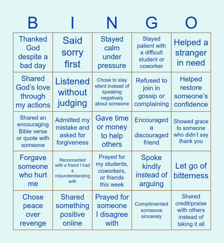 This bingo card has 25 words: Forgave someone who hurt me, Shared something positive online, Gave time or money to help others, Complimented someone sincerely, Helped a stranger in need, Thanked God despite a bad day, Said sorry first, Stayed calm under pressure, Encouraged a discouraged friend, Let go of bitterness, Shared God’s love through my actions, Listened without judging, Prayed for someone I disagree with, Spoke kindly instead of arguing, Helped restore someone’s confidence, Chose peace over revenge, Admitted my mistake and asked for forgiveness, Chose to stay silent instead of speaking negatively about someone, Refused to join in gossip or complaining, Showed grace to someone who didn’t say thank you, Shared an encouraging Bible verse or quote with someone, Reconnected with a friend I had a misunderstanding with, Prayed for my students, coworkers, or friends this week, Stayed patient with a difficult student or coworker and Shared credit/praise with others instead of taking it all.