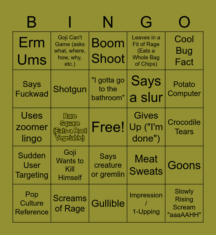 This bingo card has a free space and 24 words: Goji Wants to Kill Himself, Screams of Rage, "I gotta go to the bathroom", Pop Culture Reference, Cool Bug Fact, Erm Ums, Says Fuckwad, Goji Can't Game (asks what, where, how, why, etc.), Gives Up ("I'm done"), Says creature or gremlin, Says a slur, Uses zoomer lingo, Meat Sweats, Goons, Shotgun, Impression / 1-Upping, Crocodile Tears, Boom Shoot, Potato Computer, Rare Square (Eats a Root Vegetable), Slowly Rising Scream "aaaAAHH", Sudden User Targeting, Leaves in a Fit of Rage (Eats a Whole Bag of Chips) and Gullible.