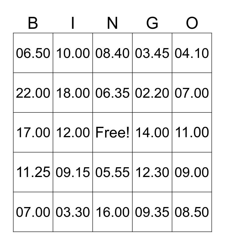 This bingo card has a free space and 24 words: 09.15, 03.30, 06.35, 07.00, 04.10, 06.50, 22.00, 10.00, 14.00, 05.55, 02.20, 17.00, 12.30, 09.00, 18.00, 09.35, 11.00, 08.40, 07.00, 12.00, 08.50, 11.25, 03.45 and 16.00.
