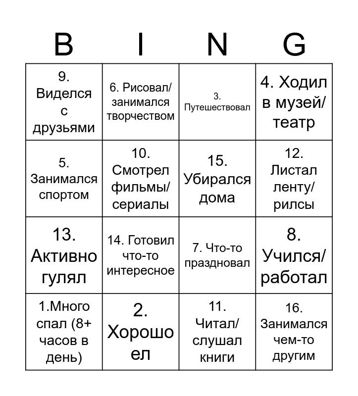 This bingo card has 16 words: 1.Много спал (8+ часов в день), 2. Хорошо ел, 3. Путешествовал, 4. Ходил в музей/театр, 5. Занимался спортом, 6. Рисовал/занимался творчеством, 7. Что-то праздновал, 8. Учился/работал, 9. Виделся с друзьями, 10. Смотрел фильмы/сериалы, 11. Читал/слушал книги, 12. Листал ленту/рилсы, 13. Активно гулял, 14. Готовил что-то интересное, 15. Убирался дома and 16. Занимался чем-то другим.