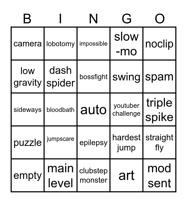 This bingo card has a free space and 24 words: jumpscare, main level, bossfight, empty, noclip, camera, low gravity, lobotomy, youtuber challenge, epilepsy, swing, sideways, hardest jump, straight fly, dash spider, art, triple spike, impossible, spam, bloodbath, mod sent, puzzle, slow -mo and clubstep monster.
