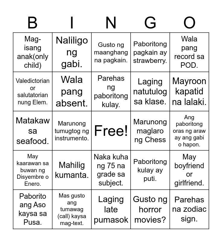 This bingo card has a free space and 29 words: Paborito ang Aso kaysa sa Pusa., Nakarating na sa ibang bansa?, Marunong tumugtog ng instrumento., Naglalagay ng emoji sa bawat chat o text., Mag-isang anak(only child), Gusto ng maanghang na pagkain., Wala pang absent., Mahilig kumanta., Marunong maglaro ng Chess, Mas gusto ang tumawag (call) kaysa mag-text., Ang paboritong oras ng araw ay ang gabi o hapon., Parehas na zodiac sign., Laging late pumasok, Gusto ng horror movies?, Mayroon kapatid na lalaki., Gustong maging guro o may propesyon sa edukasyon., Naka kuha ng 75 na grade sa subject., May kaarawan sa buwan ng Disyembre o Enero., Wala pang record sa POD., Matakaw sa seafood., Paboritong kulay ay puti., Math ang favorite na subject., Laging natutulog sa klase., Valedictorian or salutatorian nung Elem., Paboritong pagkain ay strawberry., Naliligo ng gabi., May boyfriend or girlfriend., Parehas ng paboritong kulay. and Takot sa multo..
