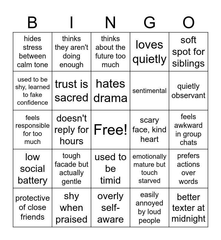 This bingo card has a free space and 24 words: tough facade but actually gentle, shy when praised, hates drama, protective of close friends, soft spot for siblings, hides stress between calm tone, used to be shy, learned to fake confidence, thinks they aren't doing enough, scary face, kind heart, used to be timid, sentimental, feels responsible for too much, emotionally mature but touch starved, prefers actions over words, trust is sacred, easily annoyed by loud people, feels awkward in group chats, thinks about the future too much, quietly observant, doesn't reply for hours, better texter at midnight, low social battery, loves quietly and overly self-aware.