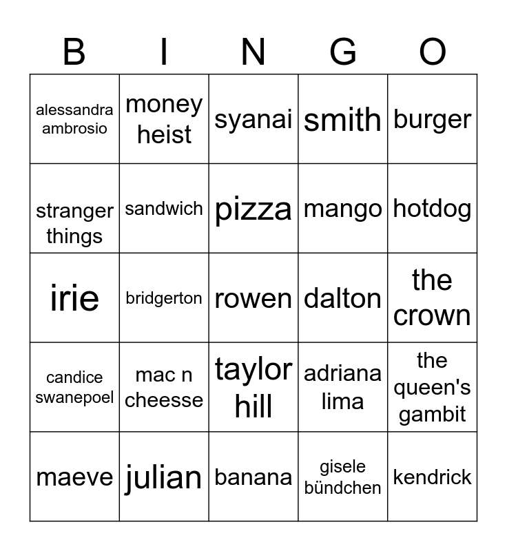 This bingo card has a free space and 24 words: mac n cheesse, julian, pizza, maeve, burger, alessandra ambrosio, stranger things, money heist, dalton, taylor hill, mango, irie, adriana lima, the queen's gambit, sandwich, gisele bündchen, the crown, syanai, hotdog, bridgerton, kendrick, candice swanepoel, smith and banana.
