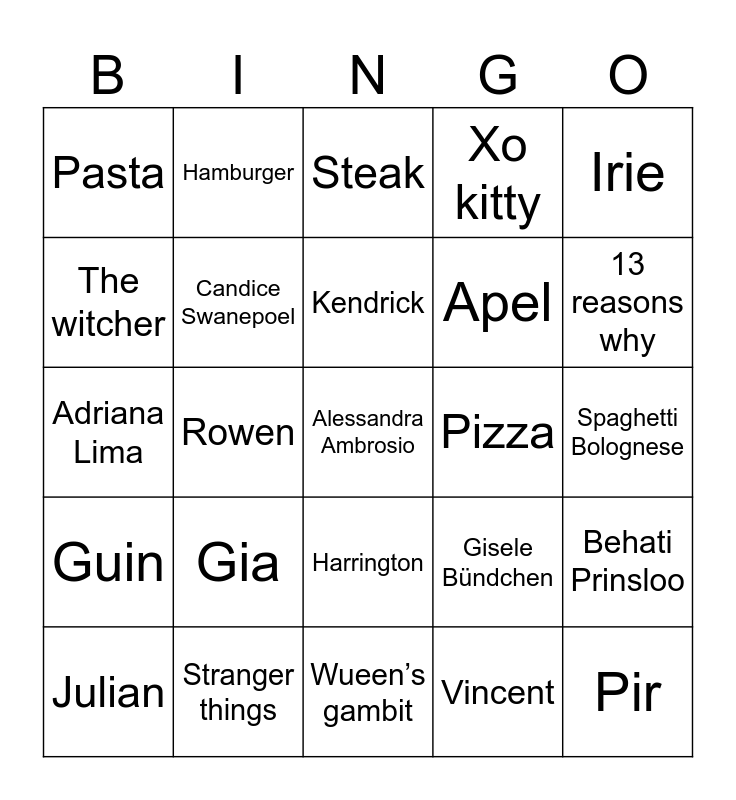 This bingo card has a free space and 24 words: Julian, Gia, Kendrick, Vincent, Irie, Pasta, Hamburger, Steak, Pizza, Spaghetti Bolognese, Adriana Lima, Candice Swanepoel, Gisele Bündchen, Behati Prinsloo, The witcher, Stranger things, Wueen’s gambit, Xo kitty, 13 reasons why, Guin, Rowen, Harrington, Apel and Pir.