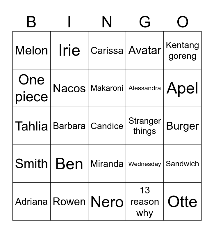 This bingo card has a free space and 24 words: Ben, Rowen, Makaroni, Adriana, Kentang goreng, Melon, One piece, Irie, Stranger things, Miranda, Alessandra, Tahlia, Wednesday, Sandwich, Nacos, 13 reason why, Burger, Carissa, Apel, Barbara, Otte, Smith, Avatar and Nero.