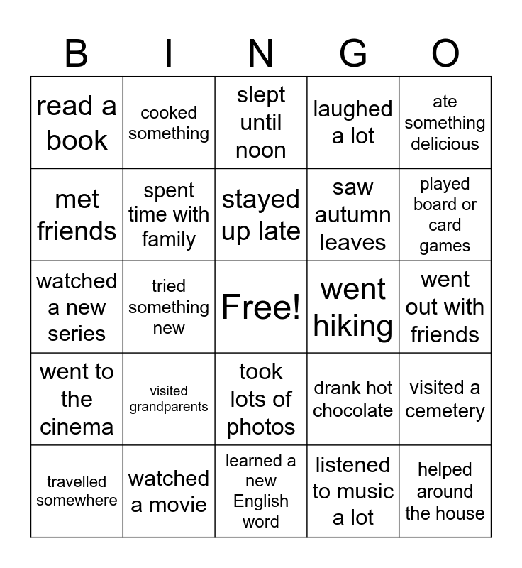 This bingo card has a free space and 24 words: visited grandparents, watched a movie, stayed up late, travelled somewhere, ate something delicious, read a book, met friends, cooked something, went hiking, took lots of photos, saw autumn leaves, watched a new series, drank hot chocolate, visited a cemetery, spent time with family, listened to music a lot, went out with friends, slept until noon, played board or card games, tried something new, helped around the house, went to the cinema, laughed a lot and learned a new English word.
