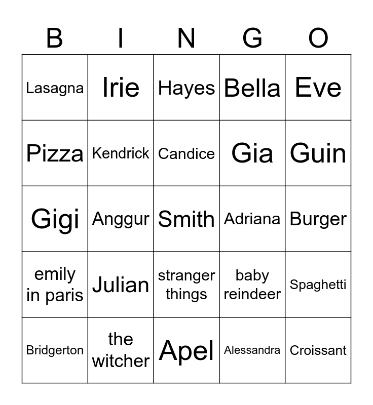 This bingo card has a free space and 24 words: Julian, the witcher, Candice, Bridgerton, Eve, Lasagna, Pizza, Irie, Adriana, stranger things, Gia, Gigi, baby reindeer, Spaghetti, Kendrick, Alessandra, Burger, Hayes, Guin, Anggur, Croissant, emily in paris, Bella and Apel.