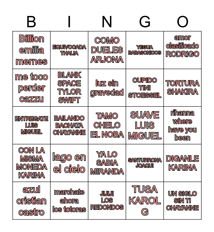 This bingo card has a free space and 24 words: lago en el cielo, marchate ahora los totoras, luz sin gravedad, azul cristian castro, amor clasificado RODRIGO, Billion emilia mernes, me toco perder cazzu, EQUIVOCADA THALIA, SUAVE LUIS MIGUEL, YA LO SABIA MIRANDA, CUPIDO TINI STOESSEL, ENTREGATE LUIS MIGUEL, SANTURRONA JOAQUI, DIGANLE KARINA, BLANK SPACE TYLOR SWIFT, TUSA KAROL G, rihanna where have you been, COMO DUELES ARJONA, TORTURA SHAKIRA, BAILANDO BACHATA CHAYANNE, UN SIGLO SIN TI CHAYANNE, CON LA MISMA MONEDA KARINA, YEGUA BABASONICOS and JIJIJI LOS REDONDOS.