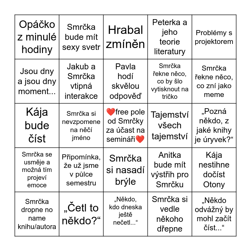 This bingo card has a free space and 24 words: Připomínka, že už jsme v půlce semestru, „Četl to někdo?“, Pavla hodí skvělou odpověď, Smrčka dropne no name knihu/autora, Problémy s projektorem, Opáčko z minulé hodiny, Jsou dny a jsou dny moment..., Smrčka bude mít sexy svetr, Tajemství všech tajemství, Smrčka si nasadí brýle, Smrčka řekne něco, co by šlo vytisknout na tričko, Kája bude číst, Anitka bude mít výstřih pro Smrčku, Kája nestihne dočíst Otony, Jakub a Smrčka vtipná interakce, Smrčka si vedle někoho dřepne, „Pozná někdo, z jaké knihy je úryvek?“, Hrabal zmíněn, Smrčka řekne něco, co zní jako meme, Smrčka si nevzpomene na něčí jméno, „Někdo odvážný by mohl začít číst...“, Smrčka se usměje a možná tím projeví emoce, Peterka a jeho teorie literatury and „Někdo, kdo dneska ještě nečetl...“.