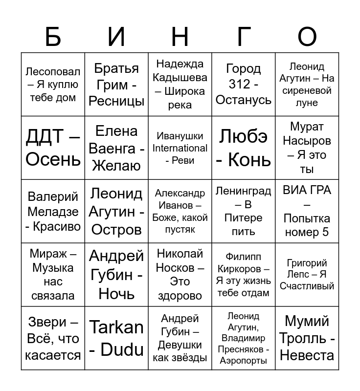 This bingo card has 50 words: ANNA ASTI - Царица, Александр Иванов – Боже, какой пустяк, Анатолий Днепров - Радовать, Андрей Губин – Девушки как звёзды, Андрей Губин - Ночь, Антон Токарев – Седьмой лепесток, Братья Грим - Ресницы, Cream Soda – Никаких больше вечеринок, ДДТ – Осень, Дима Билан – Молния, Елена Ваенга - Желаю, Город 312 - Останусь, Григорий Лепс – Я Счастливый, Филипп Киркоров – Я эту жизнь тебе отдам, Ирина Аллегрова – Свадебные цветы, Ирина Аллегрова - Угонщица, Иванушки International - Реви, Ленинград – В Питере пить, Леонид Агутин, Анжелика Варум - Королева, Леонид Агутин – На сиреневой луне, Леонид Агутин - Остров, Леонид Агутин, Владимир Пресняков - Аэропорты, Лесоповал – Я куплю тебе дом, Любэ - Конь, Михаил Шуфутинский - Марджанджа, Мумий Тролль - Невеста, Мурат Насыров – Я это ты, Муслим Магомаев – Синяя вечность, Надежда Кадышева – Широка река, Николай Носков – Это здорово, Reflex - Танцы, ROZHDEN - Знаешь, Сергей Лазарев – В самое сердце, Сергей Трофимов – Город Сочи, Tarkan - Dudu, Татьяна Буланова – Мой ненаглядный, Валерий Меладзе – Салют, Вера, Валерий Меладзе – Текила Любовь, Винтаж – Плохая девочка, ВИА ГРА – Попытка номер 5, Юлия Савичева- Если в сердце живёт любовь, Юрий Шатунов – Белые розы, Жуки - Батарейка, Звери – Районы кварталы, Звери – Всё, что касается, Валерий Меладзе - Красиво, ANNA ASTI – По барам, Руки Вверх – Крошка моя, Мираж – Музыка нас связала and Иванушки International – Тополиный пух.