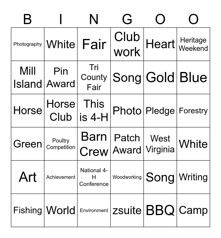 This bingo card has 104 words: Free!, Head, Heart, Hands, Health, Member, Leader, Amazing, Outstanding, Outdoors, Sheep, Beef, Swine, Goat, Cloverbud, Camp, Fair, To Make the Best Better, Wonderful, I Dare You, Charter, All Star, Leader, Volunteer, Junior Counselor, Pledge, Song, Club work, Community, Service, Green, White, West Virginia, Cooking, Fishing, Environment, Outdoors, Outstanding, Pin Award, Patch Award, Poster, Photo, Writing, Heritage Weekend, Quilting, Photography, History, Horse, Rabbit, Art, Hobbies, Achievement, Woodworking, Agriculture, Poultry, Judging, National, Leadership, Dog, Forestry, This is 4-H, Friends, Family, Community, Country, World, Green, White, Gold, Blue, West Virginia, Hardy County, 2025, WVU Extension, 4-H, Camp Pinnacle, Arkansaw, Barn Crew, Kessel, Rock Oak, Oakdale, Mountainview, Mill Island, Old Fields, Horse Club, Teen Leader, National 4-H Conference, National 4-H Congress, Email, zsuite, enrollment, State Camping, State Fair, Poultry Competition, BBQ, Certificate, Ribbon, Tri County Fair, Song, Pledge, Beyond Ready, Plant Science, Vet Science and Projects.
