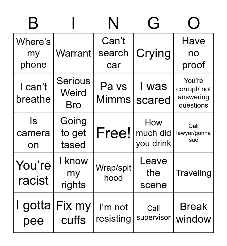 This bingo card has a free space and 29 words: I gotta pee, It’s not my car/rental, Going to get tased, Name and badge, Where’s my phone, Can’t search car, Serious Weird Bro, I know my rights, How much did you drink, Fix my cuffs, Call lawyer/gonna sue, Break window, I’m not resisting, Call supervisor, You’re corrupt/ not answering questions, Do you know my family, Wrap/spit hood, You’re racist, Have no proof, Is camera on, Leave the scene, I want a female officer, I was scared, I can’t breathe, Crying, Warrant, Traveling, Pa vs Mimms and Live right there.