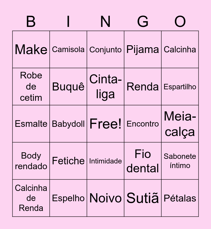 This bingo card has a free space and 33 words: Aliança, Amor, Babydoll, Batom, Body rendado, Buquê, Calcinha, Calcinha de Renda, Camisola, Cetim, Cinta-liga, Conjunto, Corpete, Desejo, Encontro, Espartilho, Espelho, Esmalte, Fetiche, Fio dental, Intimidade, Lingerie, Make, Meia-calça, Noivo, Pétalas, Pijama, Renda, Robe de cetim, Sabonete íntimo, Sedução, Sutiã and Vela aromática.