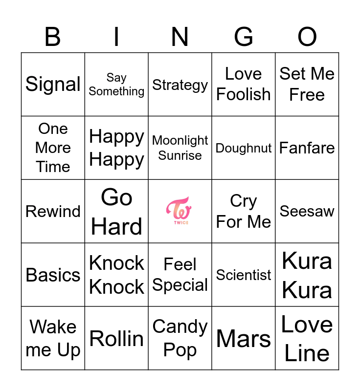 This bingo card has a free space and 39 words: TT, Like OOH-AHH, More & More, Happy Happy, Wake me Up, Feel Special, Moonlight Sunrise, What is Love?, Set Me Free, Basics, Go Hard, Love Foolish, Love Line, Seesaw, Cry For Me, Knock Knock, Heart Shaker, Signal, Likey, Scientist, One More Time, Candy Pop, Doughnut, Fanfare, Better, Oxygen, You Only, One in a Million, Better, Say Something, Say Yes, Say You Love Me, Strategy, Rollin, Mars, Push & Pull, Kura Kura, Rewind and Scandal.