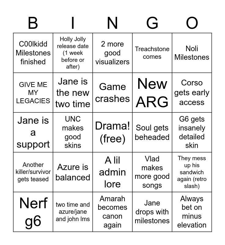 This bingo card has a free space and 24 words: Azure is balanced, two time and azure/jane and john lms, Game crashes, Nerf g6, Noli Milestones, C00lkidd Milestones finished, GIVE ME MY LEGACIES, Holly Jolly release date (1 week before or after), Soul gets beheaded, A lil admin lore, New ARG, Jane is a support, Vlad makes more good songs, They mess up his sandwich again (retro slash), Jane is the new two time, Jane drops with milestones, G6 gets insanely detailed skin, 2 more good visualizers, Corso gets early access, UNC makes good skins, Always bet on minus elevation, Another killer/survivor gets teased, Treachstone comes and Amarah becomes canon again.