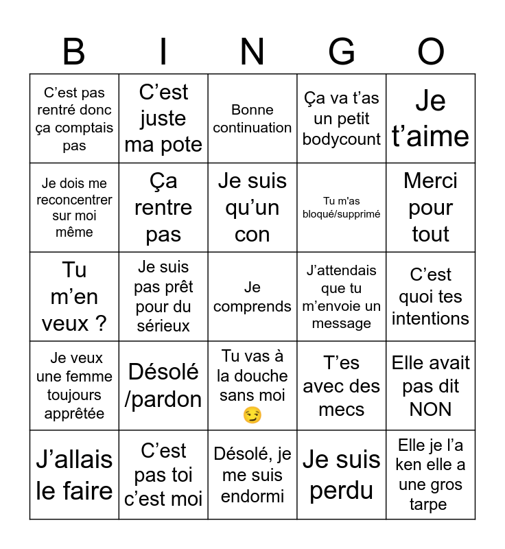 This bingo card has a free space and 24 words: Désolé /pardon, C’est pas toi c’est moi, Je suis qu’un con, J’allais le faire, Je t’aime, C’est pas rentré donc ça comptais pas, Je dois me reconcentrer sur moi même, C’est juste ma pote, J’attendais que tu m’envoie un message, Tu vas à la douche sans moi 😏, Tu m'as bloqué/supprimé, Tu m’en veux ?, T’es avec des mecs, Elle avait pas dit NON, Ça rentre pas, Je suis perdu, C’est quoi tes intentions, Bonne continuation, Merci pour tout, Je suis pas prêt pour du sérieux, Elle je l’a ken elle a une gros tarpe, Je veux une femme toujours apprêtée, Ça va t’as un petit bodycount and Désolé, je me suis endormi.