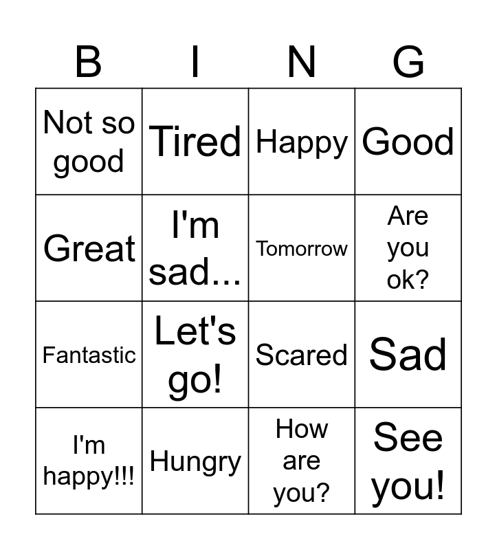 This bingo card has 16 words: Hungry, Sad, Happy, Not so good, Fantastic, Tired, Scared, How are you?, Great, I'm sad..., I'm happy!!!, Good, Let's go!, Are you ok?, Tomorrow and See you!.