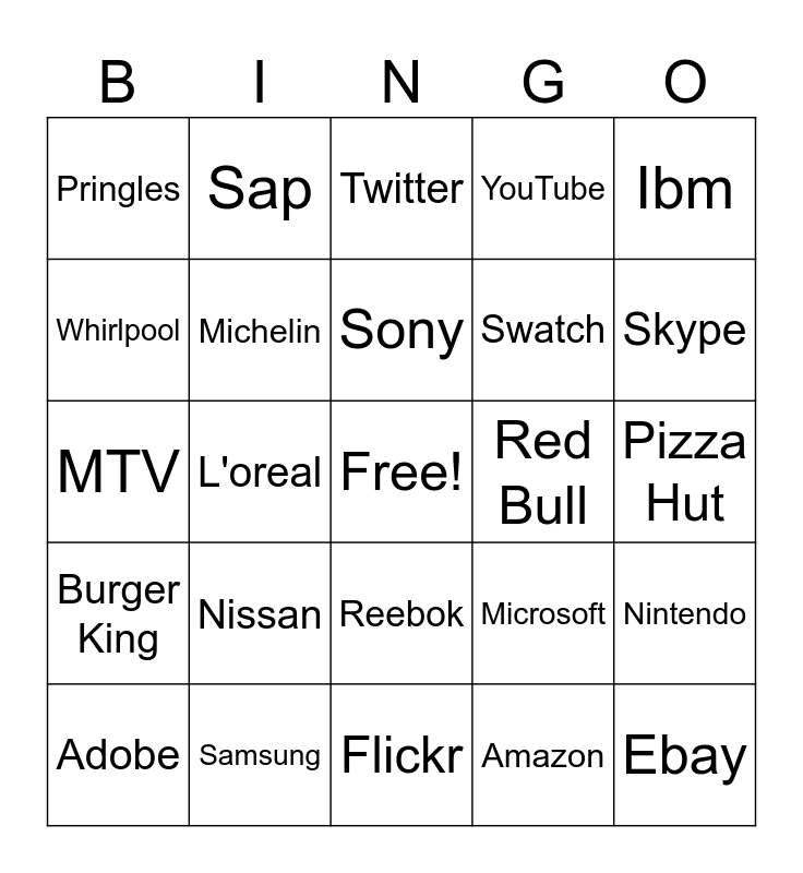 This bingo card has a free space and 30 words: Samsung, Volkswagen, L'oreal, Nescafe, Pringles, Twitter, Michelin, Reebok, Red Bull, Flickr, Pizza Hut, Ebay, Amazon, McDonald's, Skype, Citroën, Microsoft, Burger King, Nissan, Ibm, MTV, Intel, Sap, Swatch, Whirlpool, YouTube, Nintendo, Adobe, Sony and MSN.