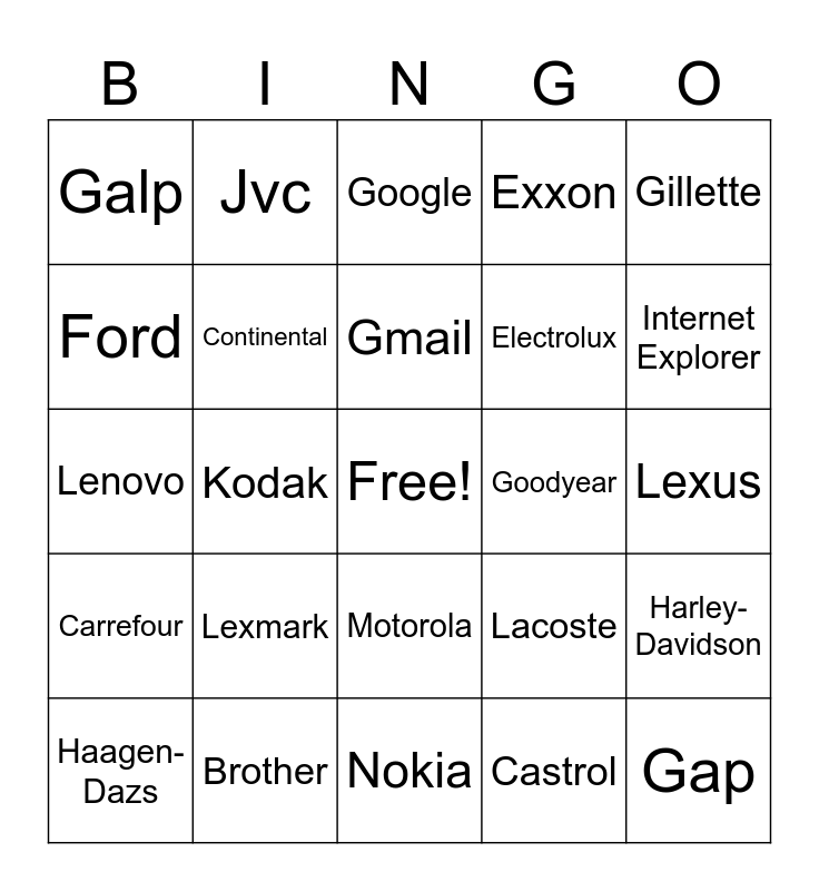 This bingo card has a free space and 60 words: Bosch, Brother, Calvin Klein, Carrefour, Castrol, Chanel, Continental, Dewalt, Electrolux, Ellesse, Exxon, Fiat, Ford, Foster's, Fox, Galp, Gap, Gillette, Glaxo Smith Kline, Gmail, Goodyear, Google, Haagen-Dazs, Harley-Davidson, Heinz, HP, HTC, Ing, Internet Explorer, Isuzu, Jägermeister, Jeep, Johnnie Walker, Juventus, Jvc, Kawasaki, KFC, Kodak, Lego, Lenovo, Levi's, Lexmark, Lexus, LG, Lacoste, Logitech, Makita, Mitsubishi, Mobil one, Motorola, Nokia, Texaco, Milka, Panasonic, PayPal, Pepsi, Peugeot, Pioneer, Pixar and Playboy.