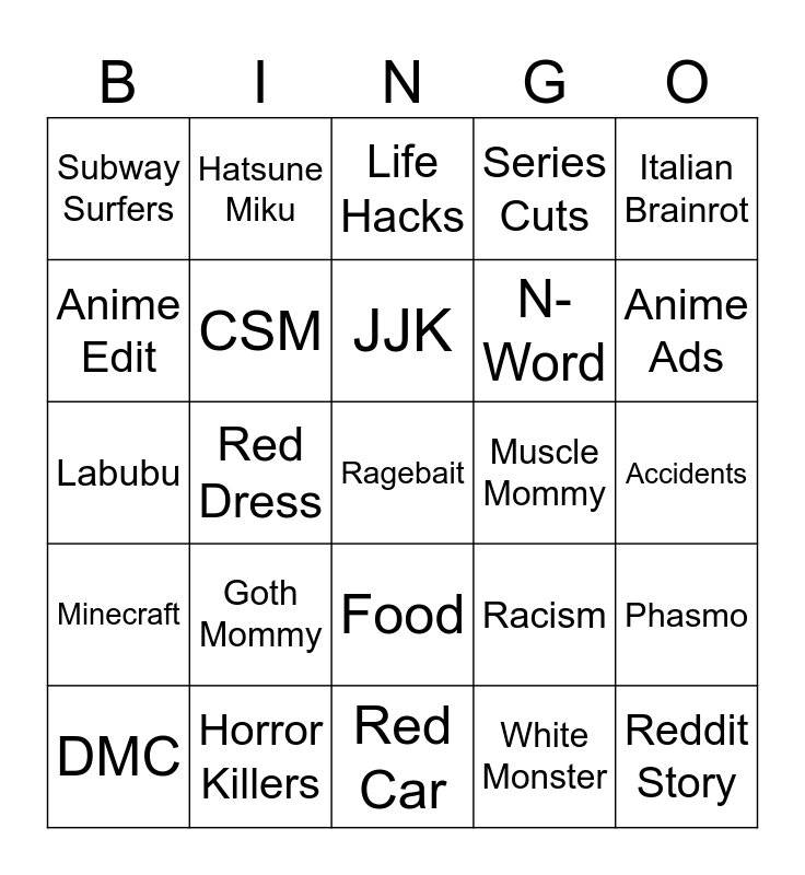 This bingo card has a free space and 24 words: Goth Mommy, Horror Killers, JJK, DMC, Italian Brainrot, Subway Surfers, Anime Edit, Hatsune Miku, Muscle Mommy, Food, N-Word, Labubu, Racism, Phasmo, CSM, White Monster, Accidents, Life Hacks, Anime Ads, Red Dress, Reddit Story, Minecraft, Series Cuts and Red Car.