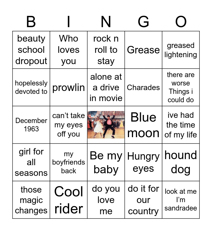 This bingo card has a free space and 60 words: Back to school again, Cool rider, score tonight, girl for all seasons, do it for our country, who’s that guy, prowlin, Reproduction, Charades, We’ll be together, Grease, summer nights, hopelessly devoted to, your the one that i want, Sandy, beauty school dropout, look at me I’m sandradee, greased lightening, its raining on prom night, alone at a drive in movie, Blue moon, rock n roll to stay, those magic changes, hound dog, born to hand jive, tears on my pillow, mooning, Freddy my love, there are worse Things i could do, we go together, love is a many splendored Thing, Sherry, Walk like a man, big Girls don’t cry, Who loves you, working my way back you, my eyes adored you, can’t take my eyes off you, rag doll, December 1963, cry for me, my boyfriends back, ive had the time of my life, Where are you tonight, Hungry eyes, overload, you don’t own me, yes, shes like the wind, Be my baby, do you love me, love man, stay, wipe out, Hey baby, some kind of wonderful, these arms of mine, cry to me, will you love me tomorrow and Love is strange.