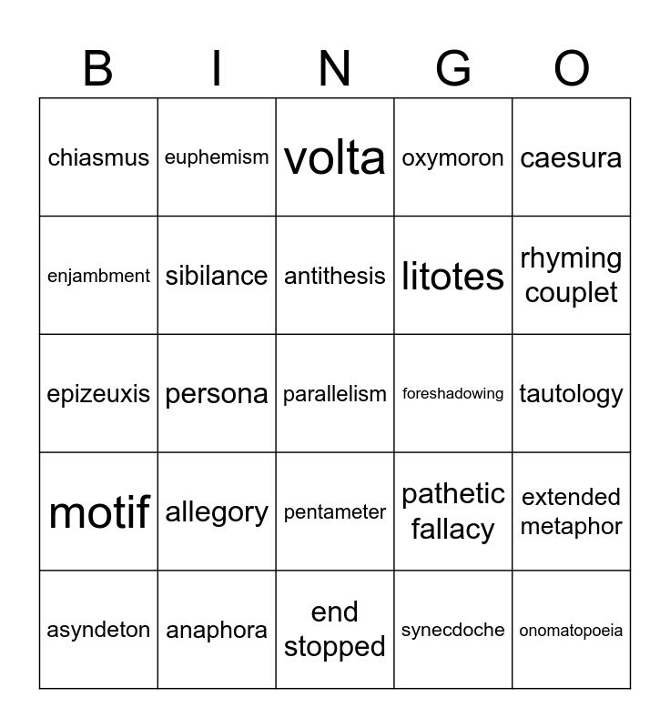 This bingo card has a free space and 24 words: allegory, anaphora, antithesis, asyndeton, caesura, chiasmus, enjambment, euphemism, foreshadowing, pentameter, litotes, epizeuxis, pathetic fallacy, extended metaphor, sibilance, synecdoche, tautology, volta, rhyming couplet, persona, onomatopoeia, motif, oxymoron and end stopped.
