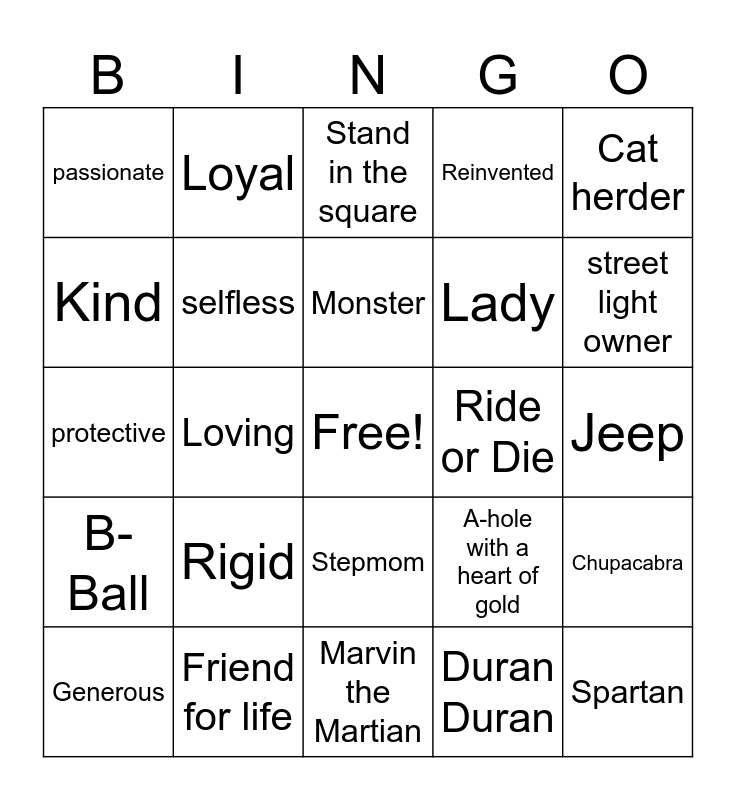 This bingo card has a free space and 34 words: GTA, Duran Duran, Coach, middle child, B-Ball, selfless, Cat herder, Generous, Loyal, Mama Hen, Monster, Stand in the square, Rub some dirt on it, Hydrate, Ride or Die, street light owner, Friend for life, protective, Rigid, A-hole with a heart of gold, Stepmom, skeptic, passionate, Jeep, Marvin the Martian, Spartan, Reinvented, Girl Power, Lady, Kind, Funny, Loving, Chupacabra and Gray Hair.