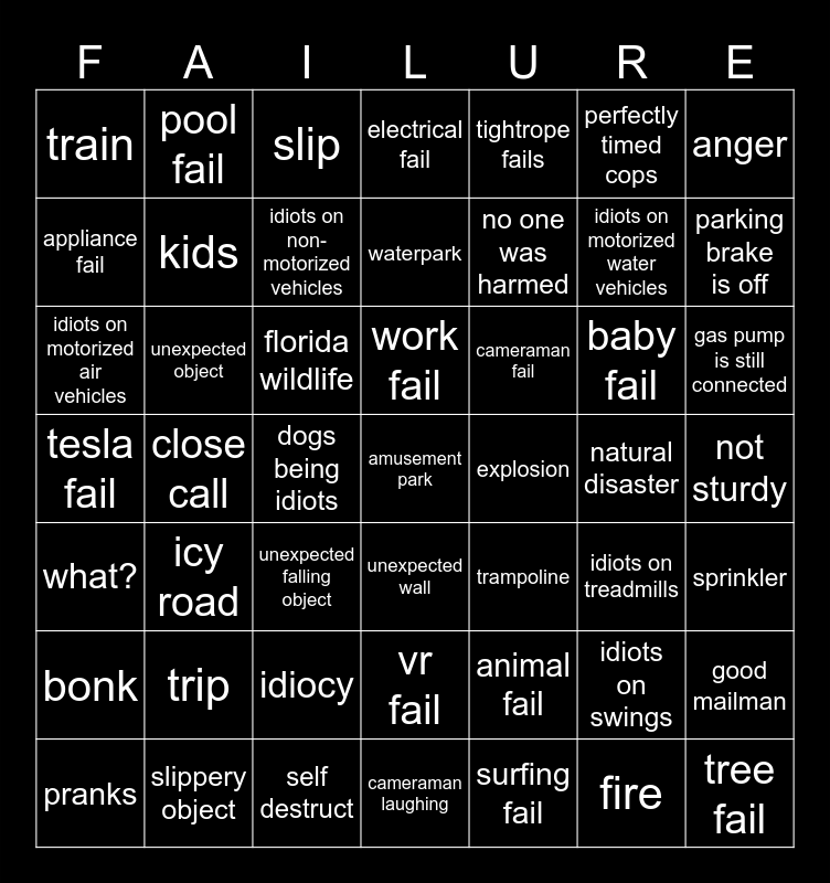 This bingo card has 85 words: not a fail, animal fail, slip, self destruct, microwave fails, idiots in motorized land vehicles, trip, how?, bonk, fire, water fail, glass break, anger, parking brake is off, poor quality, train, gas pump is still connected, perfectly timed cops, crash, unexpected wall, sprinkler, kids, idiots on motorized water vehicles, phone fail, no one was harmed, thunder, tree fail, spontaneous combustion, bad mailman, sport fail, florida wildlife, animal jumpscare, trampoline, waterpark, amusement park, natural disaster, close call, blindfold fail, unexpected object, idiots on non-motorized vehicles, idiocy, icy road, nut shot, cooking fail, not sturdy, slippery object, surfing fail, pranks, gym fail, unexpected flying tire, pool fail, appliance fail, unexpected falling object, hail, heavy downpour, fishing fails, tesla fail, electrical fail, idiots on treadmills, idiots on swings, arcade, snowboarding fails, birthday fails, expensive fails, gymnastic fails, tightrope fails, unexpected collapse, baby fail, vr fail, furniture, no one was harmed when someone was harmed, what?, wind, good mailman, park fail, work fail, dogs being idiots, winter fail, wedding fail, idiots on horses, idiots on motorized air vehicles, explosion, cameraman laughing, cameraman fail and food fail.
