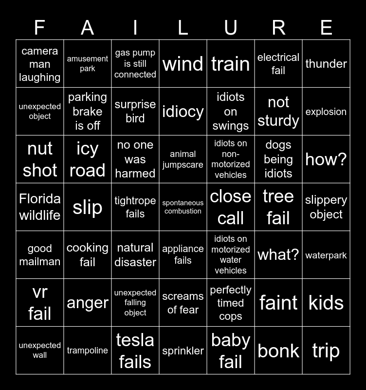 This bingo card has 92 words: not a fail, animal fail, slip, self-destruct, microwave fails, idiots in motorized land vehicles, trip, how?, bonk, fire, water fail, glass break, anger, parking brake is off, poor quality, train, gas pump is still connected, perfectly timed cops, crash, unexpected wall, sprinkler, kids, idiots on motorized water vehicles, phone fail, no one was harmed, thunder, tree fail, spontaneous combustion, bad mailman, sport fail, Florida wildlife, animal jumpscare, trampoline, waterpark, amusement park, natural disaster, close call, blindfold fails, unexpected object, idiots on non-motorized vehicles, idiocy, icy road, nut shot, cooking fail, not sturdy, slippery object, surfing fail, pranks, gym fails, unexpected flying tire, pool fails, appliance fails, unexpected falling object, hail, heavy downpour, fishing fails, tesla fails, electrical fail, idiots on treadmills, idiots on swings, arcade, snowboarding fails, birthday fails, expensive fails, gymnastic fails, tightrope fails, unexpected collapse, baby fail, vr fail, furniture, no one was harmed when someone was harmed, what?, wind, good mailman, park fail, work fails, dogs being idiots, winter fail, wedding fail, idiots on horses, idiots on motorized air vehicles, explosion, camera man laughing, camera man fail, food fail, faint, screams of fear, the unexpected, plane fails, surprise waves, surprise bird and cat fail.