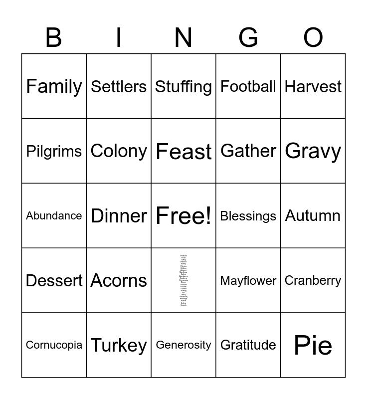 This bingo card has a free space and 26 words: Gratitude Feast Turkey Harvest Family Pilgrims Settlers Autumn Mayflower Gather Abundance Cranberry Cornucopia Dinner Thankful Football Dessert Stuffing Pie Gravy Generosity Blessings Acorns Colony Squash, Gratitude, Feast, Turkey, Harvest, Family, Pilgrims, Settlers, Autumn, Mayflower, Gather, Abundance, Cranberry, Cornucopia, Dinner, Thankful, Football, Dessert, Stuffing, Pie, Gravy, Generosity, Blessings, Acorns, Colony and Squash.