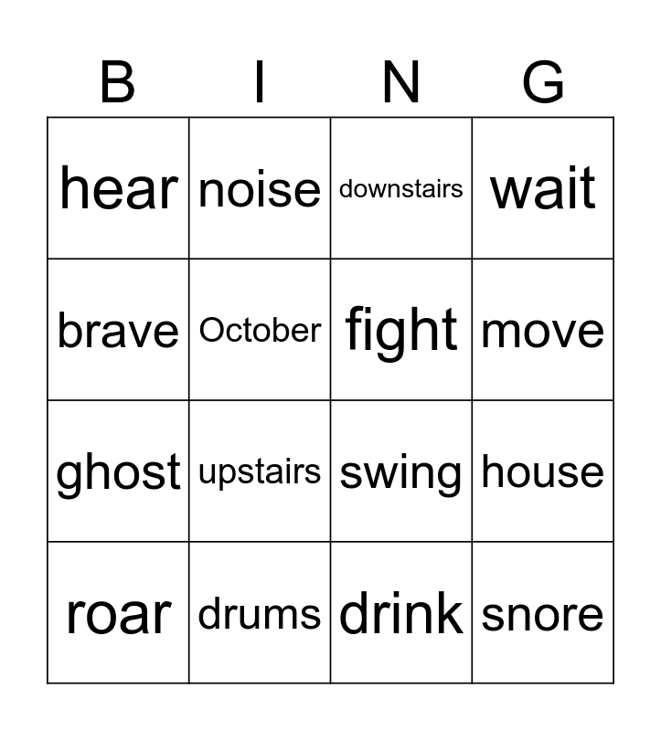 This bingo card has 16 words: drums, house, downstairs, hear, ghost, noise, swing, drink, brave, October, roar, wait, upstairs, move, fight and snore.