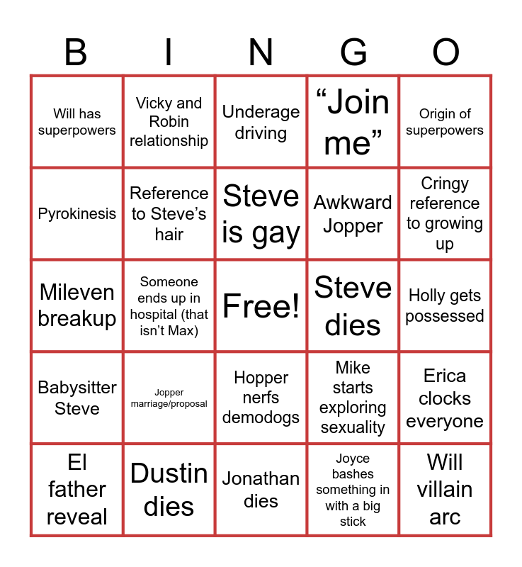 This bingo card has a free space and 24 words: Jopper marriage/proposal, Dustin dies, Steve is gay, El father reveal, Origin of superpowers, Will has superpowers, Pyrokinesis, Vicky and Robin relationship, Steve dies, Hopper nerfs demodogs, Awkward Jopper, Mileven breakup, Mike starts exploring sexuality, Erica clocks everyone, Reference to Steve’s hair, Joyce bashes something in with a big stick, Holly gets possessed, Underage driving, Cringy reference to growing up, Someone ends up in hospital (that isn’t Max), Will villain arc, Babysitter Steve, “Join me” and Jonathan dies.