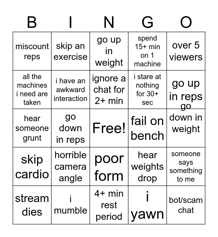 This bingo card has a free space and 24 words: horrible camera angle, i mumble, ignore a chat for 2+ min, stream dies, over 5 viewers, miscount reps, all the machines i need are taken, skip an exercise, fail on bench, poor form, i stare at nothing for 30+ sec, hear someone grunt, hear weights drop, someone says something to me, i have an awkward interaction, i yawn, go down in weight, go up in weight, go up in reps, go down in reps, bot/scam chat, skip cardio, spend 15+ min on 1 machine and 4+ min rest period.