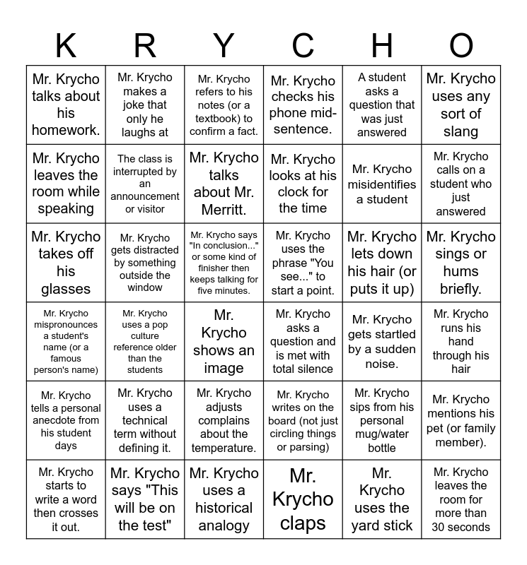 This bingo card has 53 words: Mr. Krycho goes on a tangent (Free Space), Mr. Krycho takes off his glasses, Mr. Krycho puts on his glasses, Mr. Krycho runs his hand through his hair, Mr. Krycho lets down his hair (or puts it up), Mr. Krycho uses the yard stick, Mr. Krycho makes a joke that only he laughs at, Mr. Krycho uses an air quote, Mr. Krycho uses any sort of slang, Mr. Krycho leaves the room for more than 30 seconds, Mr. Krycho leaves the room while speaking, Mr. Krycho uses a historical analogy, Mr. Krycho uses a pop culture reference older than the students, Mr. Krycho mispronounces a student's name (or a famous person's name), The projector/screen malfunctions, Mr. Krycho shows an image, The class is interrupted by an announcement or visitor, Mr. Krycho gets distracted by something outside the window, Mr. Krycho erases the board but erases something he shouldn't have, A student asks a question that was just answered, Mr. Krycho calls on a student who just answered, Mr. Krycho tells a personal anecdote from his student days, Mr. Krycho talks about Mr. Merritt., Mr. Krycho talks about his homework., A student tries to dispute a fact with Mr. Krycho, Mr. Krycho asks a question and is met with total silence, Mr. Krycho sips from his personal mug/water bottle, Mr. Krycho mentions coffee or caffeine, Mr. Krycho writes on the board (not just circling things or parsing), Mr. Krycho looks at his clock for the time, Mr. Krycho uses the phrase "back in my day", Mr. Krycho says "This will be on the test", Mr. Krycho paces for more than 30 seconds, Mr. Krycho leans back in his chair (dangerously far), Mr. Krycho claps, Mr. Krycho mentions his pet (or family member)., Mr. Krycho checks his phone mid-sentence., Mr. Krycho gets startled by a sudden noise., Mr. Krycho refers to his notes (or a textbook) to confirm a fact., Mr. Krycho spills or almost spills a drink., The bell rings while Mr. Krycho is still mid-explanation., Mr. Krycho uses an analogy involving food or cooking., Mr. Krycho says "In conclusion..." or some kind of finisher then keeps talking for five minutes., "Don't tell me how to live my life", Mr. Krycho mentions another class or student., Mr. Krycho sings or hums briefly., Mr. Krycho adjusts complains about the temperature., Mr. Krycho starts to write a word then crosses it out., Mr. Krycho misidentifies a student, Mr. Krycho uses the phrase "You see..." to start a point., Mr. Krycho wears a different tie, Mr. Krycho uses a technical term without defining it. and Mr. Krycho gestures wildly with both hands..