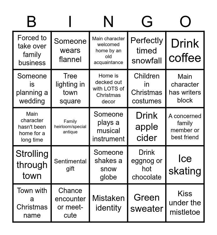 This bingo card has 100 words: Free!, A "Christmas miracle", A concerned family member or best friend, Airport travel problems, Almost kissed/interrupted/failed attempt, Animal saves the day, Bad ex/significant other, Bells are jingling, Big Christmas party, Unwanted BF/GF shows up unexpectedly, Boss makes an unreasonable request, Build a snowman, Business in danger of closing, Chance encounter or meet-cute, Character sits on Santa's lap, Character drinks from a cup that clearly empty, Children in Christmas costumes, Christmas card/letter/note, Christmas carolers, Christmas shopping, Christmas wish comes true, Clumsy moment, Cozy fire, Crisis at work, Decorate tree, Drink apple cider, Drink coffee, Drink eggnog or hot chocolate, Driving accident, Fake relationship, Family heirloom/special antique, Forced to take over family business, Fundraising for a cause, Goes sledding/skiing, Green sweater, Home is decked out with LOTS of Christmas decor, Ice skating, Inaccurate involvement from a stranger, Someone gets judged for ordering a frilly drink, Kiss under the mistletoe, Leads don't get along, Love interest is a widow, Main character hasn't been home for a long time, Main character is a struggling artist, Main character has writers block, Main character welcomed home by an old acquaintance, Main characters share a dance, Meddling family member or best friend, Memory loss, Mistaken identity, Misunderstanding causes a breakup, Movie set is mainly in a shop/store, Mysterious man with a white beard, New York is mentioned, Nutcracker decor, Old flame appears, Packing up/moving home, Participates in a Christmas themed competition, People come together to save the day, Perfectly timed snowfall, Prince, Princess, or Royalty, Red winter coat, Returns to hometown, Reunited with lost love, Romantic carriage ride, Romantic Kiss, Romantic proposal, Santa character raising money for charity, Santa in disguise/Santa is real, Scrooge type, Searching for something that is lost, Sentimental gift, Small town Christmas tradition, Snowball fight, Someone drives a pickup, Someone drives an old red pickup, Someone else has a crush on the love interest, Someone is planning a wedding, Someone is scheming/plotting, Someone LOVES Christmas, Someone bakes Christmas goodies, Someone plays a musical instrument, Someone reveals their dream job, Someone shakes a snow globe, Someone shares a childhood memory, Someone wears flannel, Special ornament, Strange/unique family food, Strange/unique family tradition, Strolling through town, Sworn off love, Talk about someone who is dead, Time travel, Town with a Christmas name, Tree lighting in town square, Ugly Christmas sweater, Unable to leave town due to bad weather, Visit a coffee shop, Visits a Christmas tree farm or lot and Wealthy "witch" type.