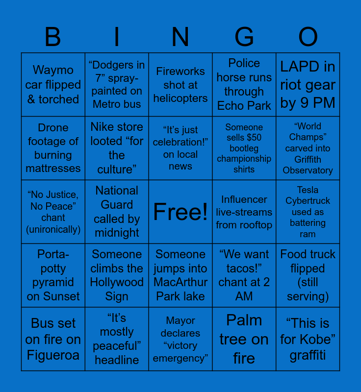 This bingo card has a free space and 24 words: Bus set on fire on Figueroa, Someone climbs the Hollywood Sign, “It’s just celebration!” on local news, Palm tree on fire, LAPD in riot gear by 9 PM, Waymo car flipped & torched, “Dodgers in 7” spray-painted on Metro bus, Fireworks shot at helicopters, Influencer live-streams from rooftop, Tesla Cybertruck used as battering ram, “No Justice, No Peace” chant (unironically), Nike store looted “for the culture”, “We want tacos!” chant at 2 AM, Food truck flipped (still serving), Drone footage of burning mattresses, “It’s mostly peaceful” headline, Mayor declares “victory emergency”, Police horse runs through Echo Park, “World Champs” carved into Griffith Observatory, Porta-potty pyramid on Sunset, National Guard called by midnight, Someone jumps into MacArthur Park lake, Someone sells $50 bootleg championship shirts and “This is for Kobe” graffiti.