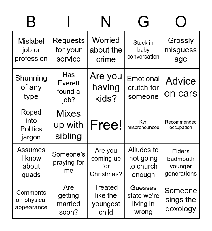 This bingo card has a free space and 24 words: Someone’s praying for me, Are getting married soon?, Are you having kids?, Comments on physical appearance, Grossly misguess age, Mislabel job or profession, Shunning of any type, Requests for your service, Kyri mispronounced, Are you coming up for Christmas?, Emotional crutch for someone, Roped into Politics jargon, Alludes to not going to church enough, Elders badmouth younger generations, Has Everett found a job?, Guesses state we’re living in wrong, Recommended occupation, Worried about the crime, Advice on cars, Mixes up with sibling, Someone sings the doxology, Assumes I know about quads, Stuck in baby conversation and Treated like the youngest child.