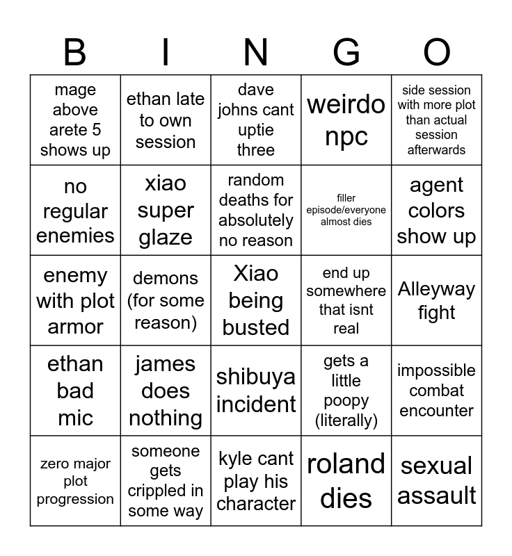 This bingo card has a free space and 28 words: impossible combat encounter, ethan not following game rules, filler episode/everyone almost dies, roland dies, no regular enemies, dave johns cant uptie three, ethan late to own session, ethan bad mic, end up somewhere that isnt real, zero major plot progression, enemy with plot armor, weirdo npc, someone gets crippled in some way, kyle cant play his character, agent colors show up, technocracy tries to convert us, james does nothing, xiao super glaze, random deaths for absolutely no reason, shibuya incident, mage above arete 5 shows up, kris deltarune gets mentioned, sexual assault, demons (for some reason), Alleyway fight, gets a little poopy (literally), side session with more plot than actual session afterwards and cameo from a different campaign.