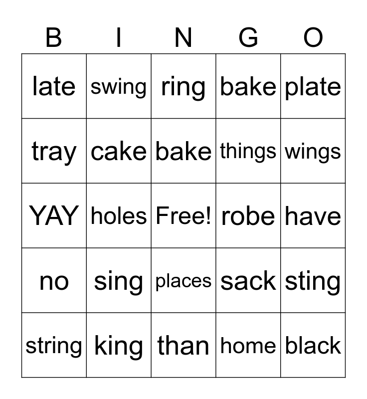 This bingo card has a free space and 35 words: ape, gray, makes, cake, places, bake, tray, for, bake, flames, YAY, plate, his, ate, late, robe, home, holes, no, black, sack, string, sting, king, ring, wings, can, those, things, have, that, than, sing, swing and spring.