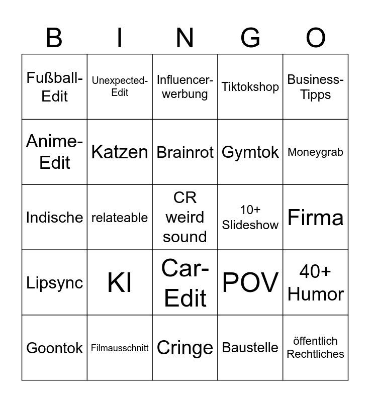 This bingo card has 25 words: KI, Cringe, Brainrot, Goontok, Business-Tipps, Fußball-Edit, Anime-Edit, Unexpected-Edit, 10+ Slideshow, Car-Edit, Gymtok, Indische, POV, 40+ Humor, Katzen, öffentlich Rechtliches, Firma, Influencer- werbung, Moneygrab, relateable, CR weird sound, Filmausschnitt, Lipsync, Tiktokshop and Baustelle.