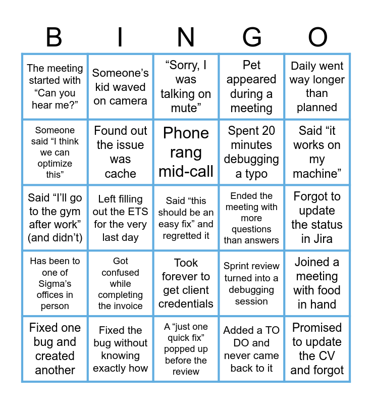 This bingo card has a free space and 29 words: Fixed one bug and created another, Deployed on a Friday (brave!), Left filling out the ETS for the very last day, Changed one thing, broke three others, The meeting started with “Can you hear me?”, “Sorry, I was talking on mute”, Found out the issue was cache, Got confused while completing the invoice, Ended the meeting with more questions than answers, Fixed the bug without knowing exactly how, Forgot to update the status in Jira, Promised to update the CV and forgot, A “just one quick fix” popped up before the review, Added a TO DO and never came back to it, Said “it works on my machine”, Joined a call while still making coffee, Took forever to get client credentials, Has been to one of Sigma’s offices in person, Daily went way longer than planned, Said “I’ll go to the gym after work” (and didn’t), Sprint review turned into a debugging session, Checked the calendar three times to confirm a meeting, Spent 20 minutes debugging a typo, Someone said “I think we can optimize this”, Pet appeared during a meeting, Someone’s kid waved on camera, Joined a meeting with food in hand, Phone rang mid-call and Woke up late but still made it on time.