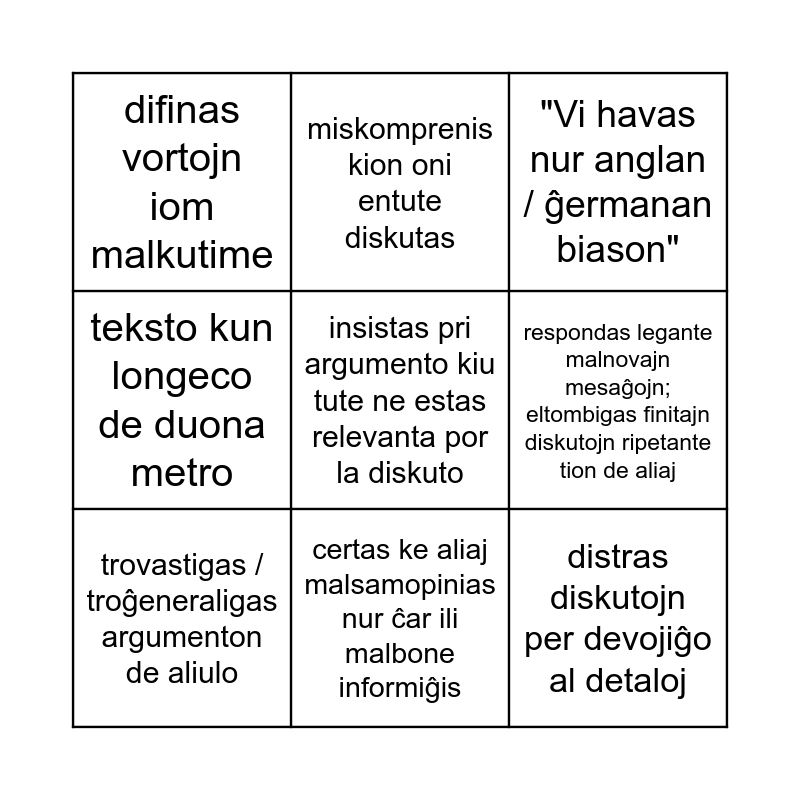 This bingo card has 9 words: trovastigas / troĝeneraligas argumenton de aliulo, "Vi havas nur anglan / ĝermanan biason", miskomprenis kion oni entute diskutas, teksto kun longeco de duona metro, difinas vortojn iom malkutime, respondas legante malnovajn mesaĝojn; eltombigas finitajn diskutojn ripetante tion de aliaj, insistas pri argumento kiu tute ne estas relevanta por la diskuto, distras diskutojn per devojiĝo al detaloj and certas ke aliaj malsamopinias nur ĉar ili malbone informiĝis.