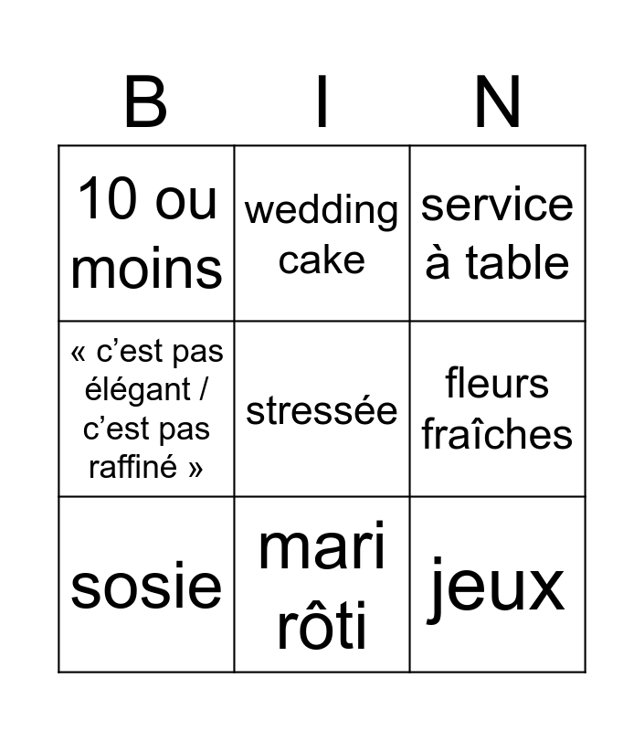 This bingo card has a free space and 8 words: fleurs fraîches, service à table, wedding cake, sosie, 10 ou moins, jeux, « c’est pas élégant / c’est pas raffiné » and mari rôti.